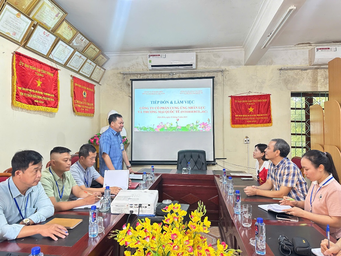Được sự đồng ý của Lãnh đạo Sở Nội vụ tỉnh Điện Biên, ngày 24/9/2025, Trung tâm Dịch vụ việc làm, Sở Nội vụ đã tiếp đón và làm việc với Công ty Cổ phần Cung ứng Nhân lực và Thương mại Quốc tế (Interserco., JSC). Tham dự buổi làm việc, về phía đại diện Sở Nội vụ có ông Nguyễn Duy Phương - Phó Giám đốc phụ trách Trung tâm Dịch vụ việc làm; ông Phạm Văn Thuận - Phó Giám đốc, cùng các viên chức Trung tâm Dịch vụ việc làm; đại diện Công ty Interserco., JS có ông Nguyễn Xuân Hiển – Phó Giám đốc công ty, cùng nhân viên Phòng Nghiệp vụ, cán bộ tuyển dụng của công ty.