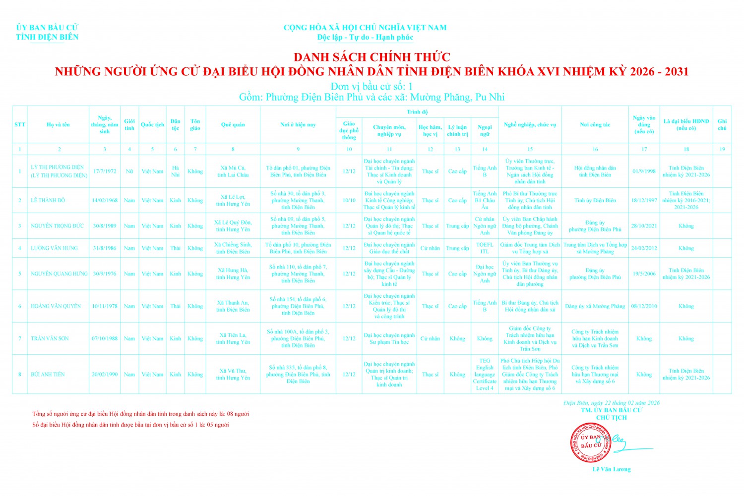 Ngày 22 tháng 02 năm 2026 Ủy ban bầu cử tỉnh ban hành Nghị quyết số 84/NQ-UBBC Công bố danh sách chính thức những người ứng cử đại biểu Hội đồng nhân dân tỉnh Điện Biên khóa XVI nhiệm kỳ 2026-2031 theo từng đơn vị bầu cử trên địa bàn tỉnh Điện Biên