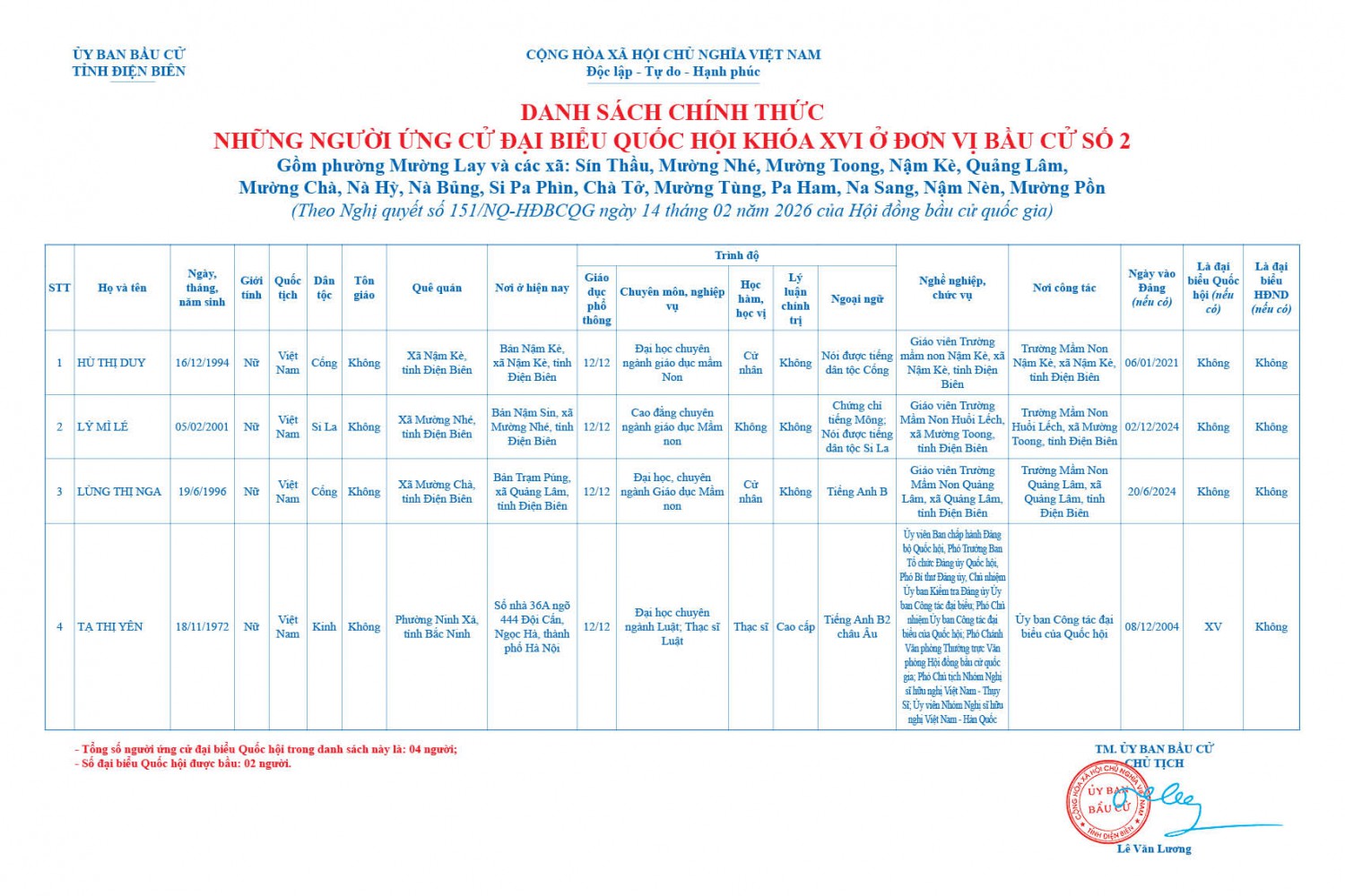 Ngày 22 tháng 02 năm 2026 Ủy ban bầu cử tỉnh ban hành Nghị quyết số 85/NQ-UBBC Công bố danh sách chính thức những người ứng cử đại biểu Quốc hội khóa XVI theo từng đơn vị bầu cử thuộc tỉnh Điện Biên.
