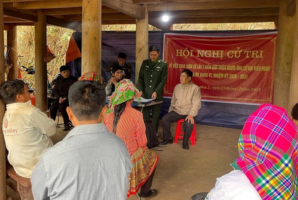 Cán bộ, chiến sĩ Đồn biên phòng Nậm Nhừ chủ trì hội nghị cử tri lấy ý kiến nhân dân bản Nậm Nhừ 2, xã Nà Hỳ đối với người ứng cử đại biểu Hội đồng nhân dân xã, nhiệm kỳ 2026-2031.