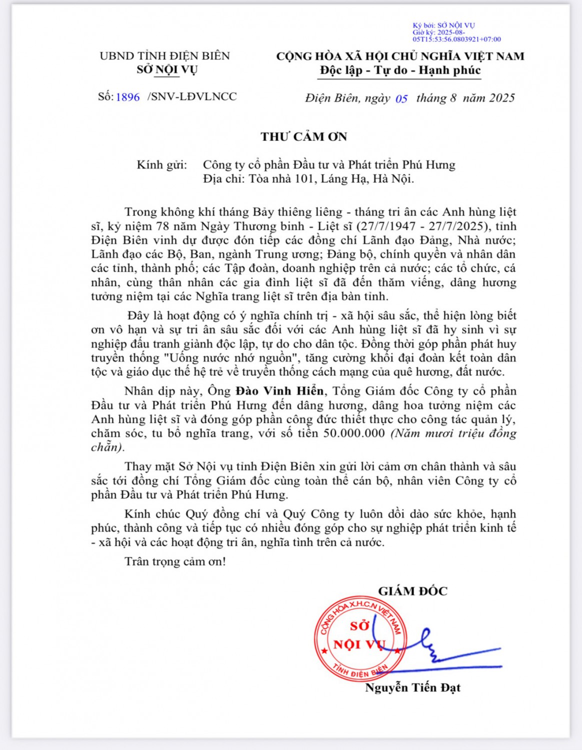 Thay mặt Sở Nội vụ tỉnh Điện Biên, Đồng chí Nguyễn Tiến Đạt - Giám đốc Sở đã gửi lời cảm ơn chân thành và sâu sắc đến Ban Lãnh đạo cùng toàn thể cán bộ, nhân viên Công ty Phú Hưng. Đồng thời Đồng chí Nguyễn Tiến Đạt bày tỏ mong muốn công ty sẽ tiếp tục có nhiều hoạt động đồng hành cùng các chương trình tri ân, nghĩa tình và phát triển kinh tế - xã hội trong thời gian tới.