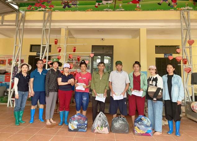 Cô giáo Nguyễn Thị Hồng (đứng thứ nhất từ trái sang) cùng đoàn thiện nguyện trao quà của các nhà hảo tâm cho các hộ dân bị thiệt hại trong mưa lũ tại xã Mường Pồn (cũ).