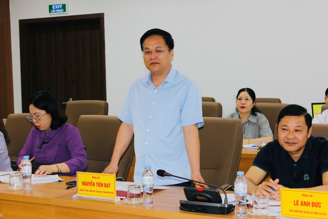 Đồng chí Nguyễn Tiến Đạt, Tỉnh ủy viên, Giám đốc Sở Nội vụ tỉnh Điện Biên phát biểu thảo luận tại Hội nghị chấm điểm sáng ngày 10/4
