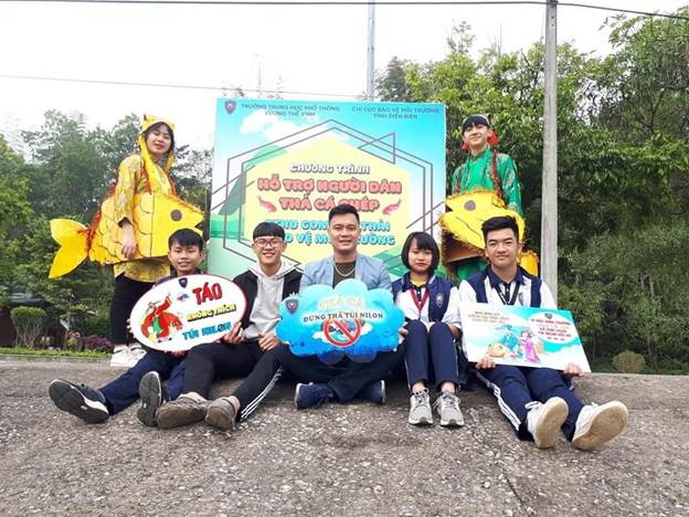 Thầy Trương Hữu Nghị cùng các em học sinh tham gia hoạt động hỗ trợ người dân thả cá chép, thu gom rác thải, bảo vệ môi trường