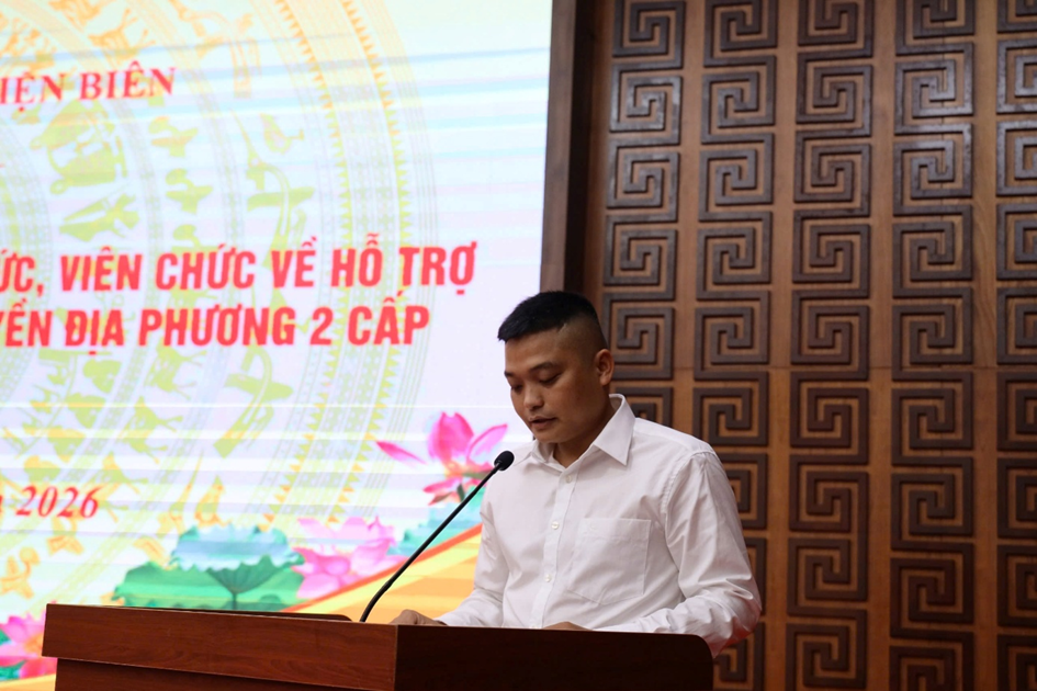 Đ/c Nông Huy Thiêm, Viên chức Trung tâm Dịch vụ việc làm, Sở Nội vụ tỉnh, biệt phái công tác tại UBND xã Tủa Thàng phát biểu chia sẻ những kết quả đạt được trong thời gian được biệt phái và những khó khăn của cơ sở hiện nay