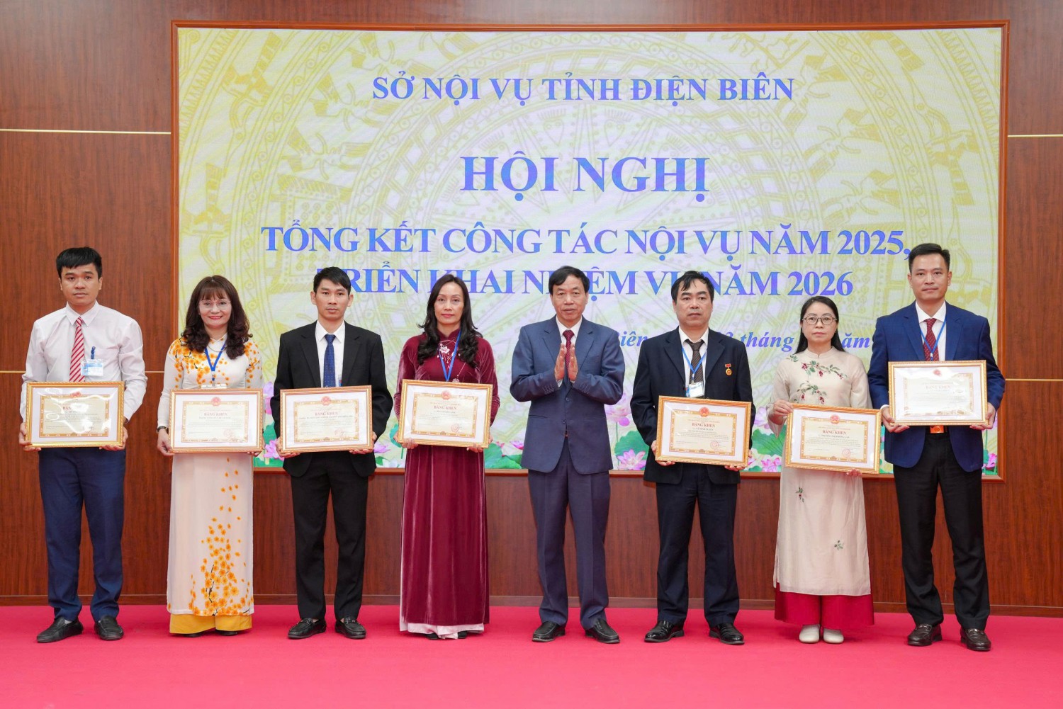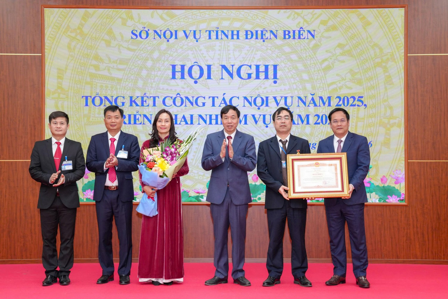 Nhân dịp này, đồng chí Chủ tịch UBND tỉnh thừa ủy quyền của Thủ tướng Chính phủ trao Bằng khen của Thủ tướng Chính phủ cho tập thể Sở Nội vụ; trao danh hiệu “Tập thể lao động xuất sắc” cho 02 tập thể, trao Bằng khen cho 2 tập thể, 10 cá nhân thành tích xuất sắc trong thực hiện Nghị quyết số 18-NQ/TW, trao Bằng khen cho 9 cá nhân về thành tích xuất sắc trong thực hiện nhiệm vụ công tác năm 2025. Bộ Công an tặng Kỷ niệm chương bảo vệ an ninh tổ quốc cho 02 cá nhân.